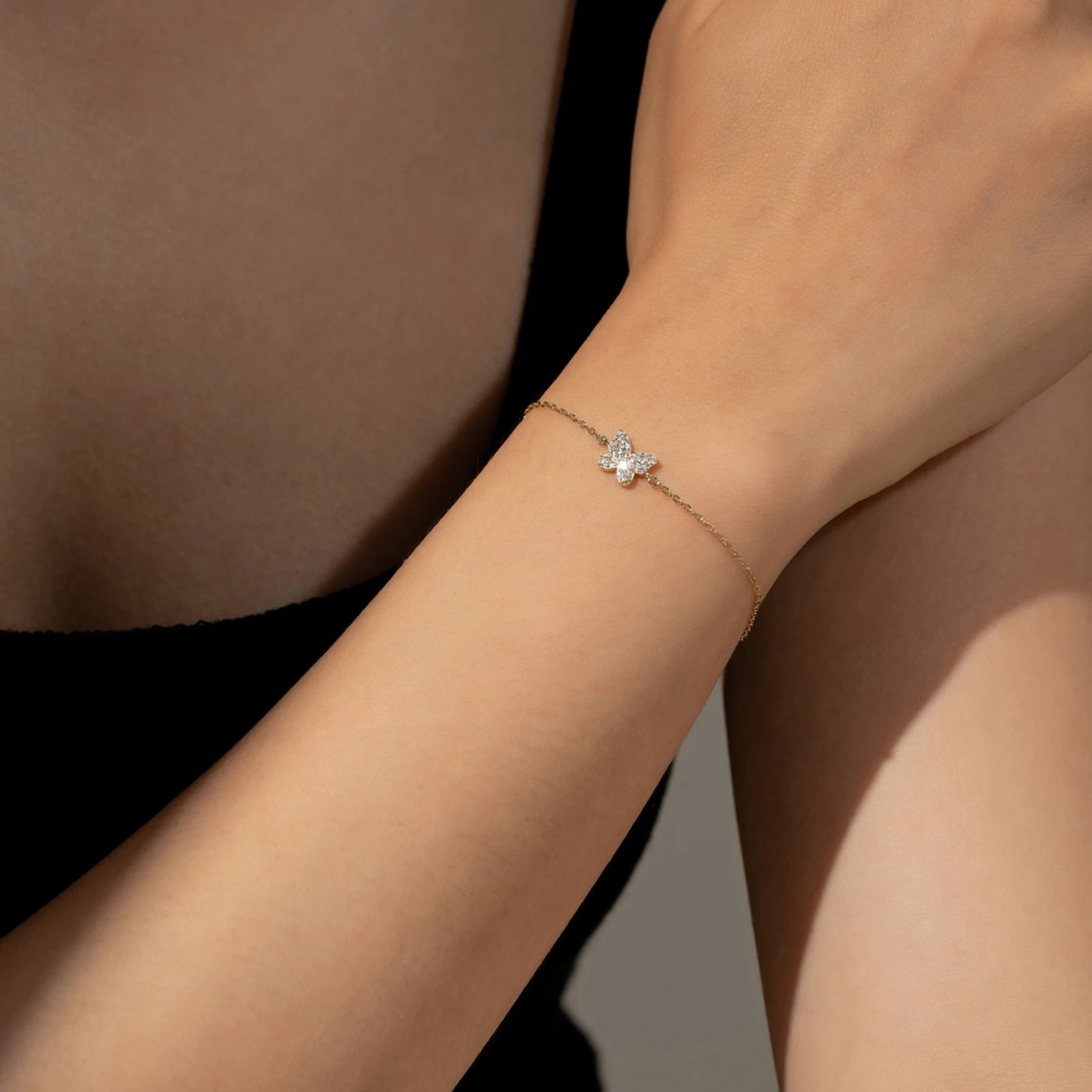 Zart, charmant und mühelos stilvoll – dieses 925 Sterling Silber Filigrane Schmetterlingsarmband ist das kleine Detail, das jedes Outfit perfekt abrundet. Die feine Gliederkette fängt bei jeder Bewegung das Licht ein, während der zarte Schmetterling mit einem dezenten Schimmer aus Zirkonia funkelt. Ob als täglicher Begleiter oder für besondere Momente – dieses 18K vergoldete Armband verleiht einen Hauch von Luxus, der sich dennoch greifbar anfühlt.