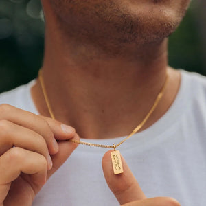 A bold and meaningful accessory, the Minimalist Engraved Bar Pendant Necklace in Silver is the perfect way to showcase your individuality. Fully customizable, this necklace allows you to engrave names, initials, dates, or meaningful words, making it a one-of-a-kind piece that reflects your personal style. Crafted from high-quality stainless steel, this necklace is built for durability, with a tarnish-resistant finish that maintains its shine over time. The hypoallergenic material ensures comfort for all-day wear, making it safe for sensitive skin. Featuring a sleek and modern bar pendant, this necklace pairs effortlessly with any outfit, whether casual or formal. Designed exclusively for men, its timeless appeal makes it a standout addition to any jewelry collection.